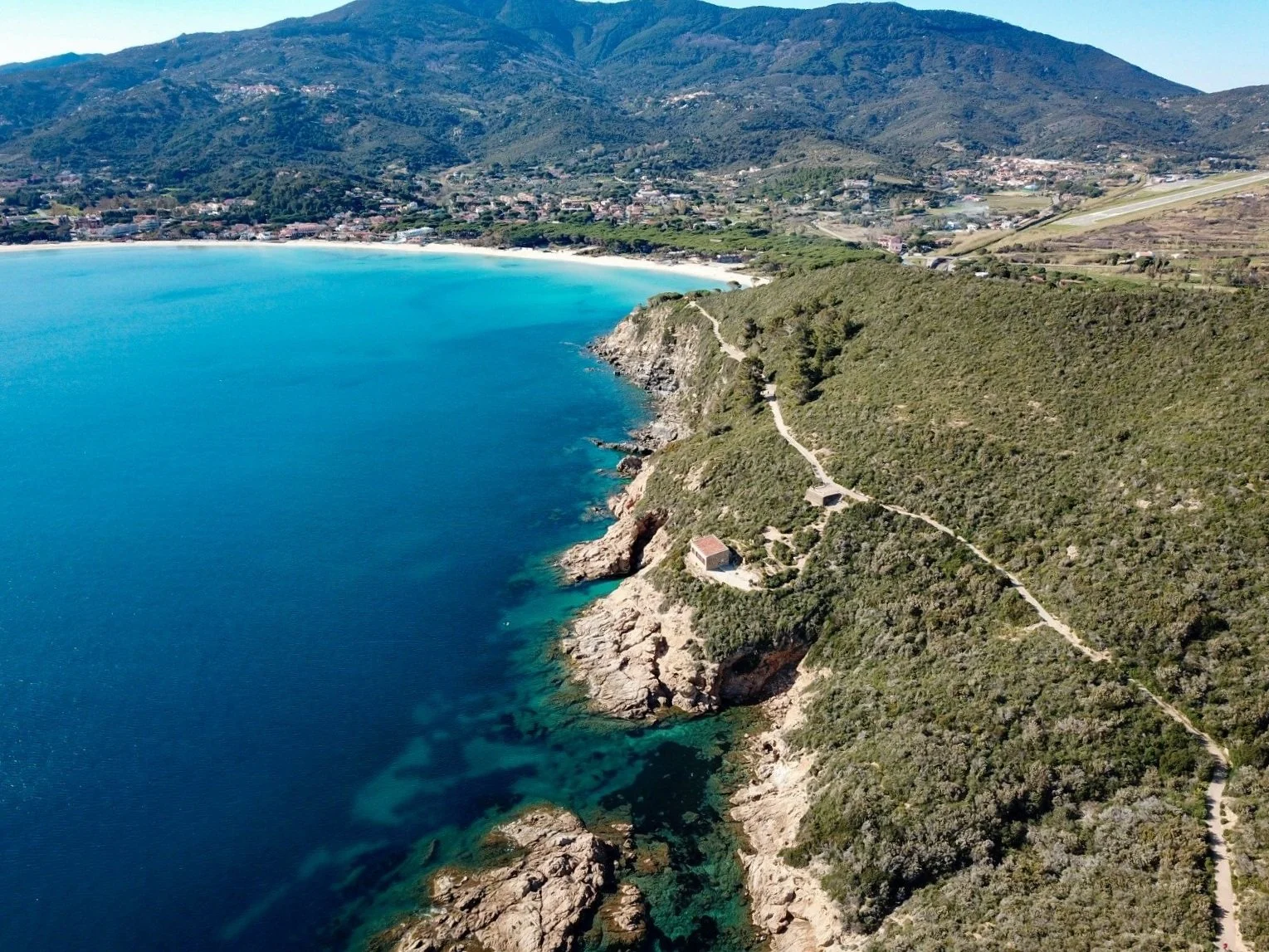 Located on Isola d’Elba, at the far end of the Marina di Campo bay, it offers a spectacular view of the islands of Montecristo and Giglio, framed by the endless horizon. The interiors, featuring a minimal yet carefully detailed design, enhance the beauty of the surrounding landscape.